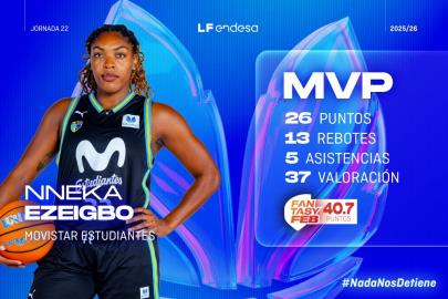 La jugadora de Movistar Estudiantes se estrena como MVP de la jornada esta temporada y además conquista el primero de su etapa con las “Mujeres de Negro”. Asimismo, es una de las diez jugadoras más populares del campo. Esta temporada, el pívot nigeriano promedia 17,27 créditos anotadores y 13,18 puntos por partido. Además, Nneka Ezeigbo es la segunda mejor reboteadora en lo que va de campaña, con una media de 8,68 atrapadas por partido, sólo por detrás de Aminata Sangaré (10,05) y por delante de Khadija Faye (8,41).