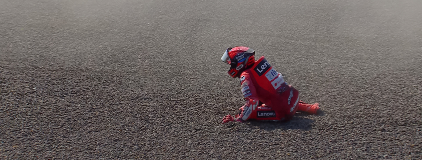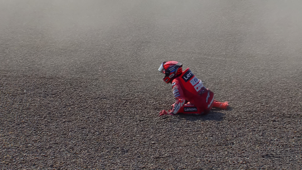 Cuando Bezzecchi se movió por el interior, el #72 etiquetó la parte posterior del #93 Ducati. Márquez se deslizó a velocidad y Bezzecchi se dirigió directamente hacia la grava, luego perdió el control y también se estrelló.
