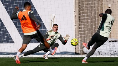 Posteriormente, los jugadores llevaron a cabo rondos de presión y ejercicios de combinación con cambios de dirección y finalización. La sesión concluyó con series de dos contra dos con disparos a portería. Rüdiger se ejercitó en solitario sobre el césped. Tchouameni, Mastantuono y Carvajal continúan con sus procesos de recuperación.
