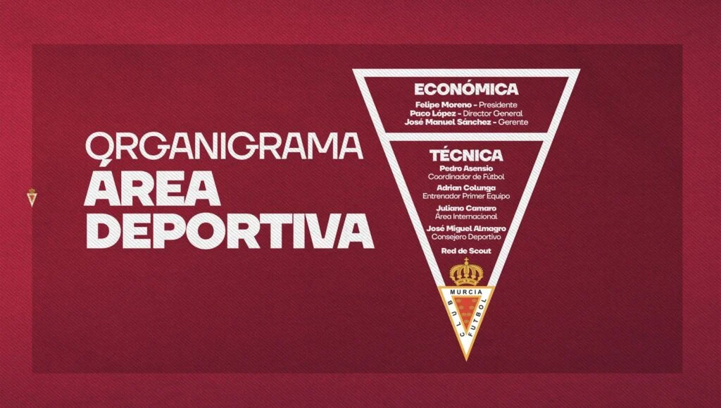 El Real Murcia C.F. ha dado a conocer la estructura completa de su Área Deportiva, un organigrama renovado que refuerza la coordinación, la planificación y el crecimiento deportivo del club en todas sus dimensiones. Esta reorganización consolida el modelo de trabajo impulsado por la entidad, basado en la profesionalización y en una gestión sólida tanto a nivel económico como técnico.