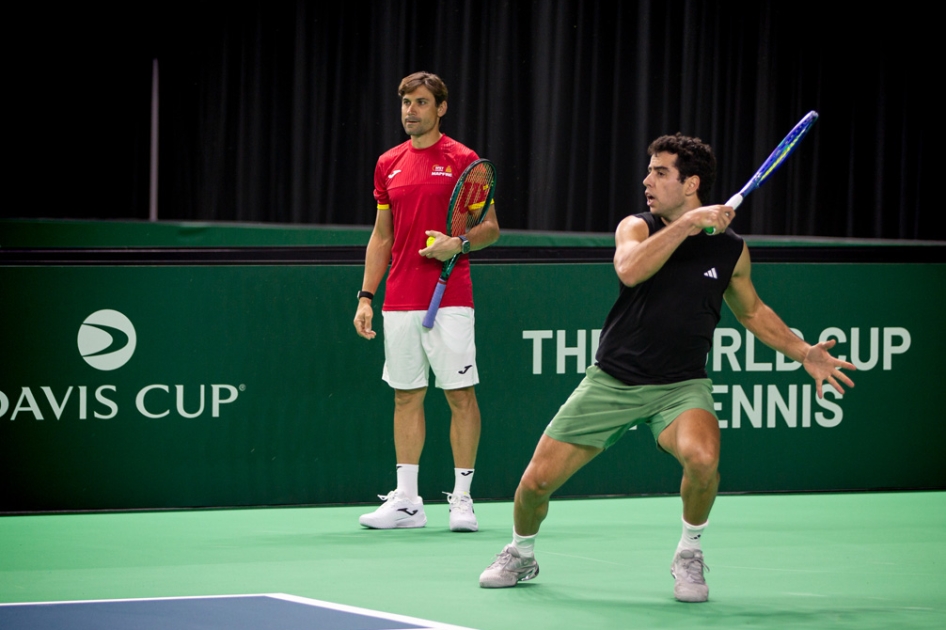 Allá Selección Española MAPFRE Tenis Realicé este sábado durante su primer entrenamiento en el Súper Arena de Tenis de la Feria de Bolonia, Italia, escenario que codirigió el Final 8 de la Copa Davis 2025 a partir del próximo mes. Jaume Munar y Pablo Carreño fueron los primeros en recorrer la pista central junto a Pedro Martínez. En los próximos días se incorporaron Marcel Granollers y Carlos Alcaraz.